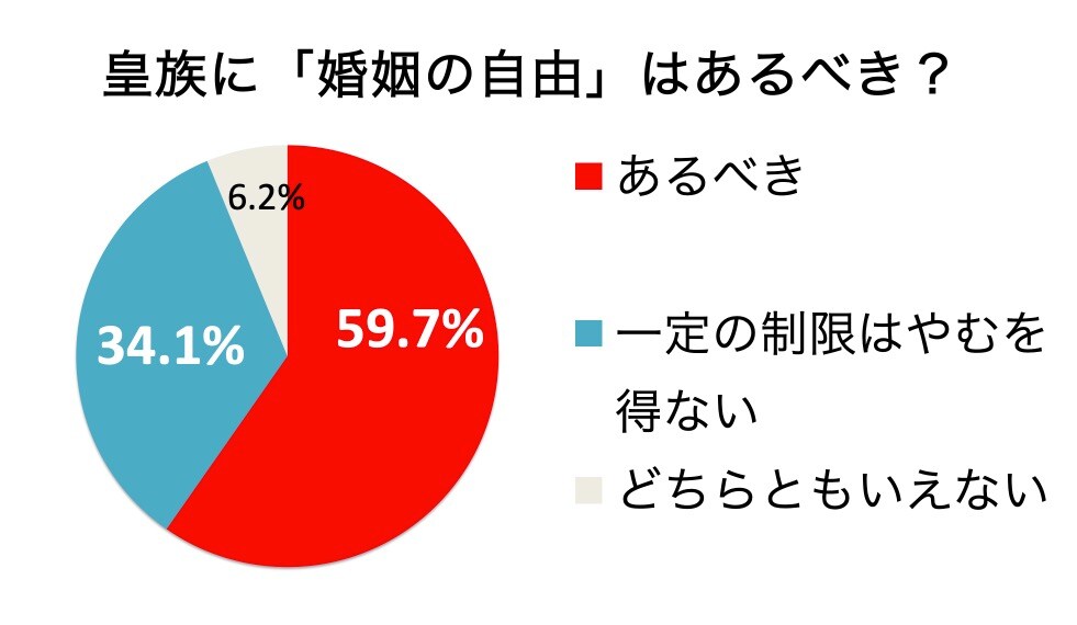 また、「皇族にも「婚姻の自由」はあるべきだと考えますか」と尋ねたところ、「あるべき」としたのが59.7%と半数を超える一方で、「一定の制限はやむを得ない」と回答した人も34.1%となりました。